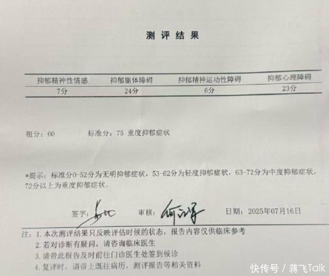 长文最后,赵露思彻底“摊牌”,放话“我不干了”,四个字斩钉截铁,全是攒了太久的失望。 她还晒出了心理诊断书:重度抑郁(75分)、重度焦虑(73分),数据刺得人眼睛疼。